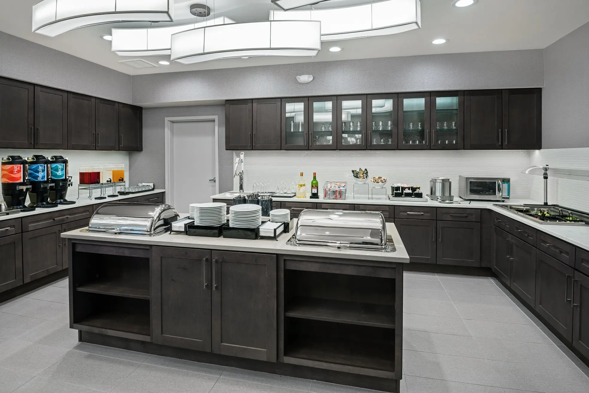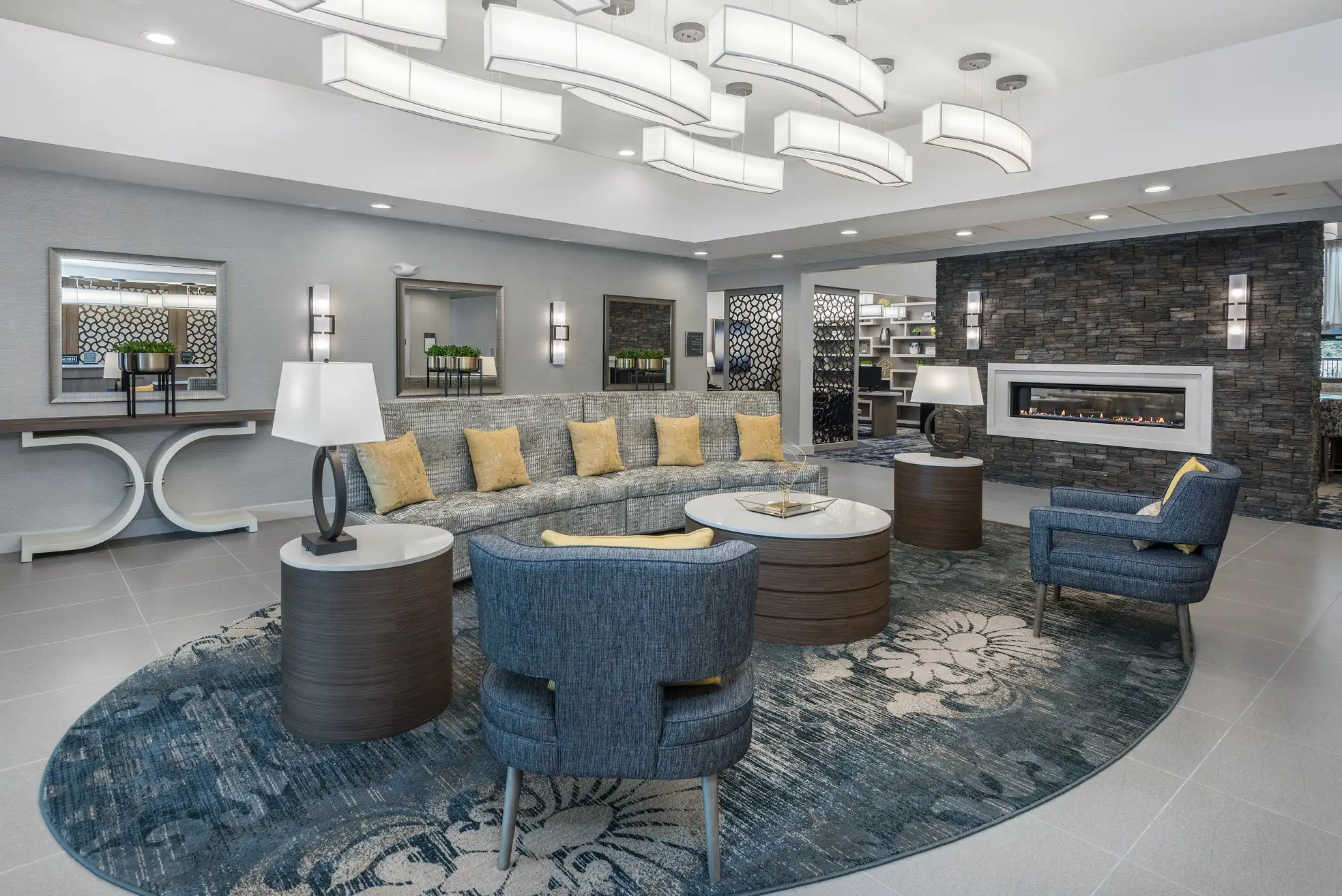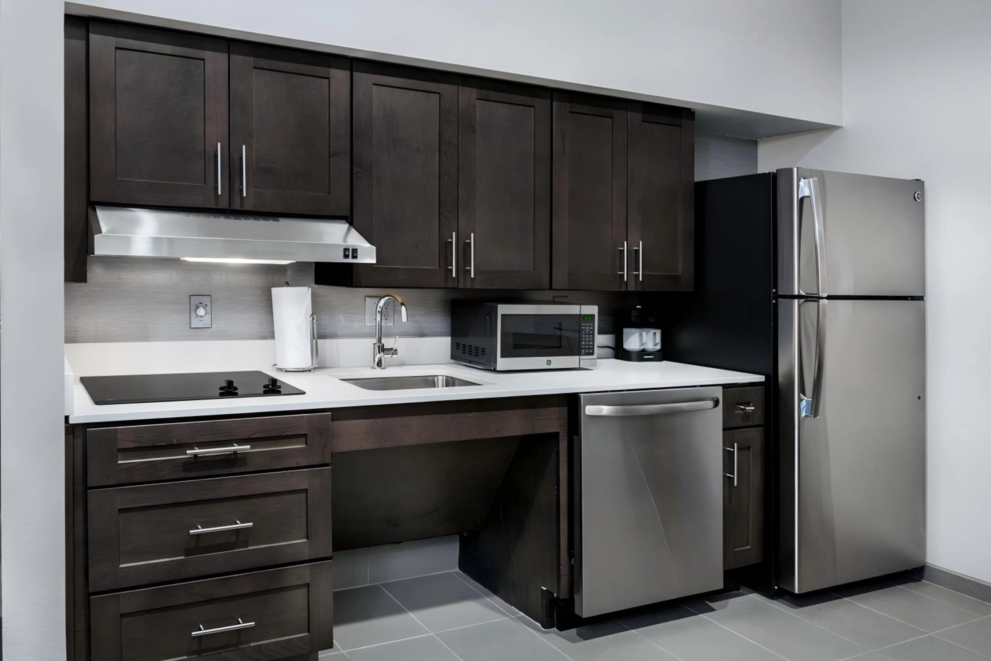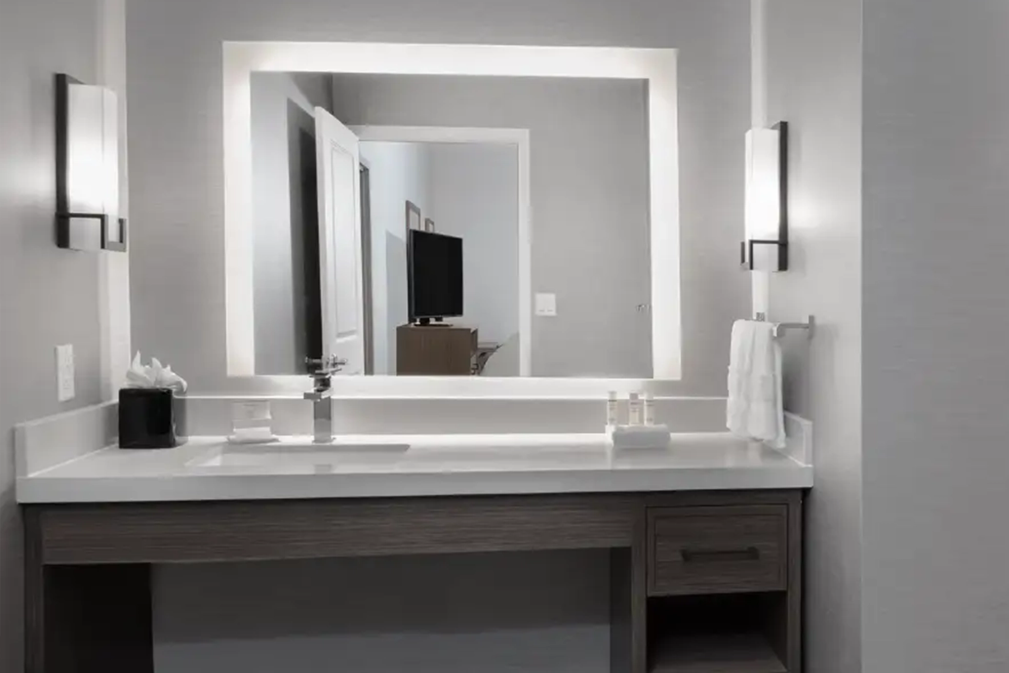 This hotel is of the Homewood Suites standard decoration. Quartz stone is extensively used as countertop materials, mainly for the kitchen countertops in guest rooms, the vanity tops in bathrooms, and the countertops in public areas.