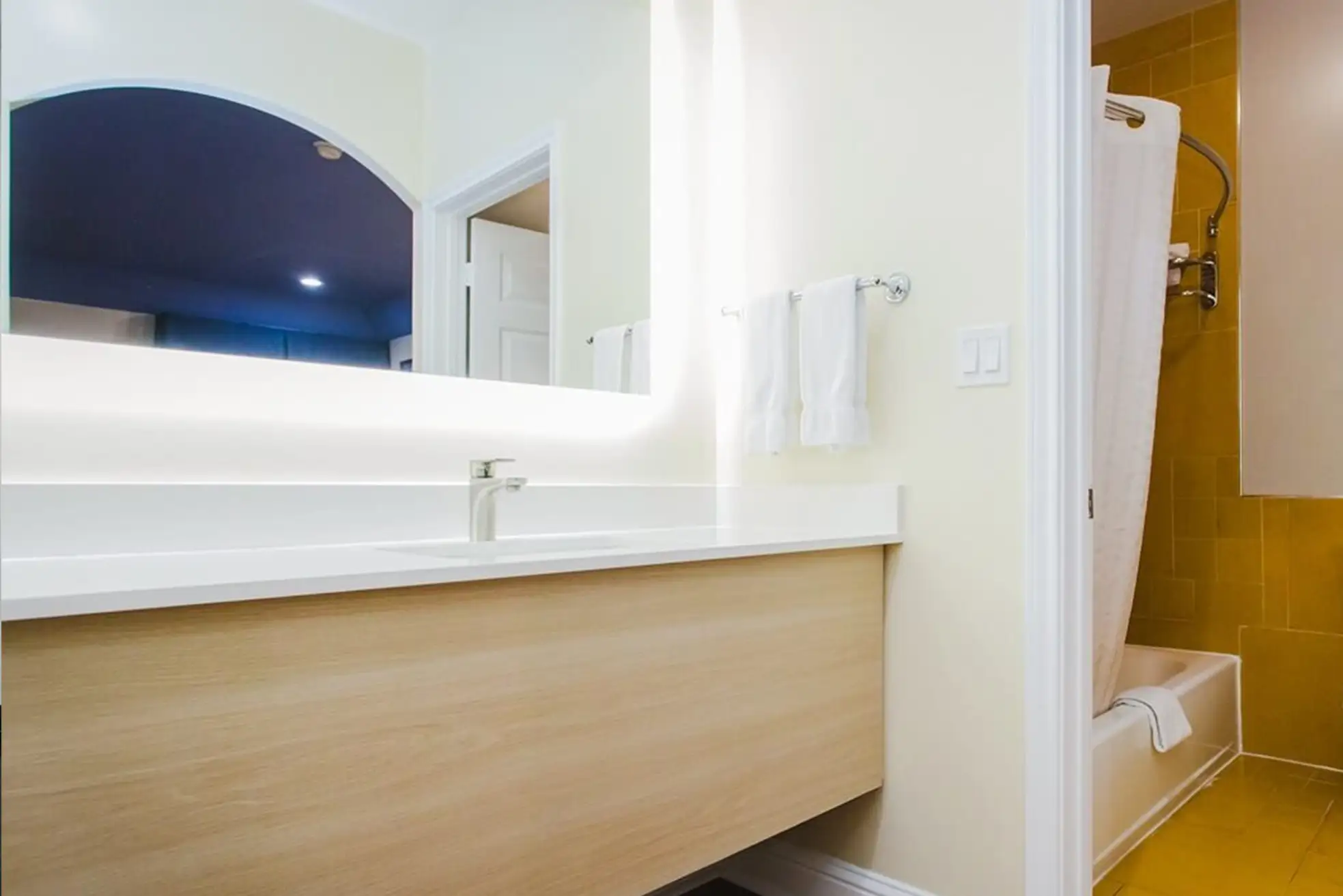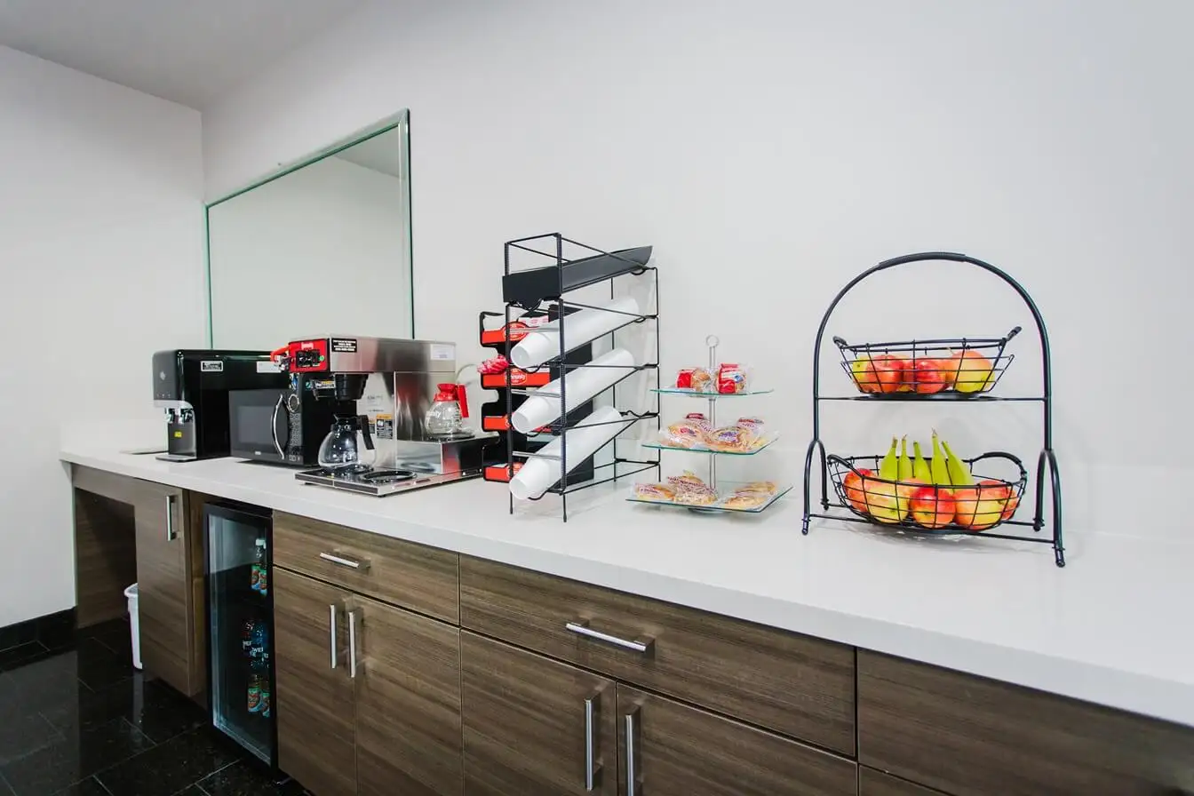 As an economy hotel, the countertops are made of artificial stone / quartz stone. The main application scenarios include bathroom sinks, lobby / public area countertops, and small bars / simple countertops in guest rooms.