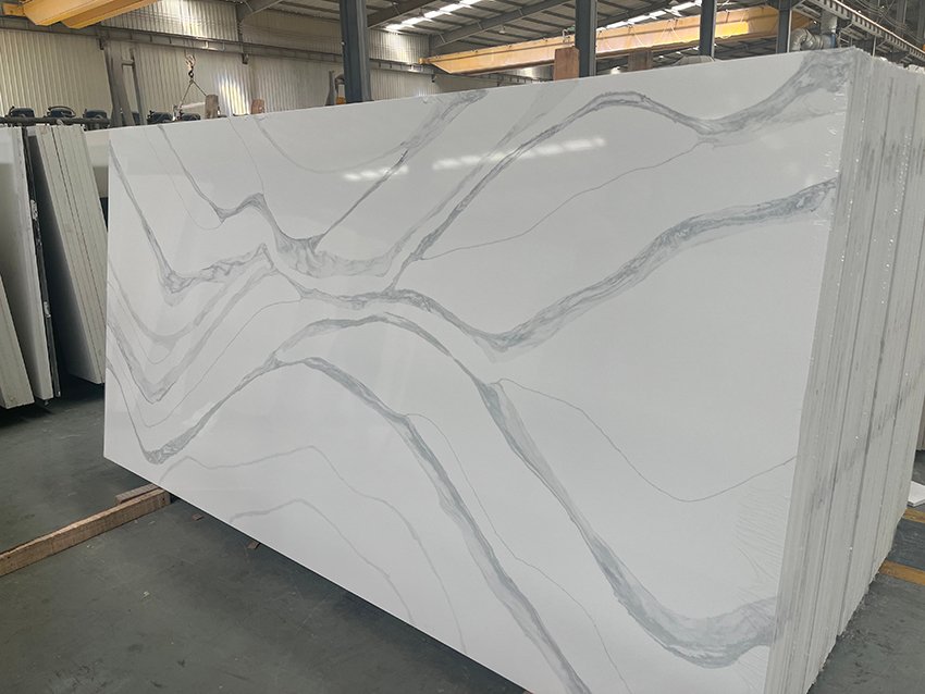 Calacatta Quartz with grey veins is a Natural quartz crystals are combined with resin and other materials to create the high-end, opulent, and adaptable surface material known as Calacatta Quartz with grey veins. Its sumptuous look, durability, and non-porousness go well with modern and contemporary house designs. Calacatta Quartz lends an air of wealth and high-end luxury and may be utilized for accent walls, bar tops, and table tops. It is a fantastic option for kitchen counters, backsplashes, showers, and floors because to its striking through-body veining, bright whites, and grey veins. In terms of cost, aesthetics, and ease of maintenance, fake quartz stone is preferable than actual stone.