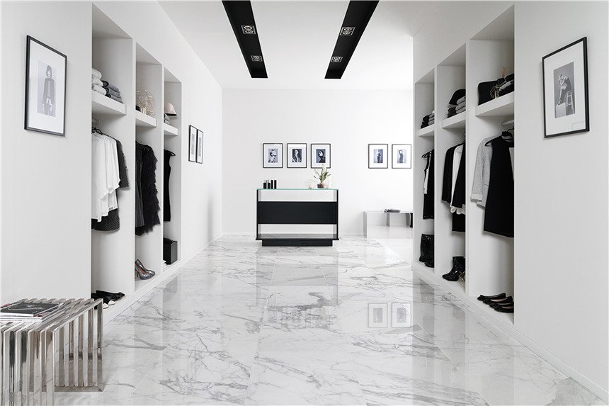 The Calacatta white tile format, when used properly, creates the appearance of a homogeneous surface that resembles a monolithic block of marble.