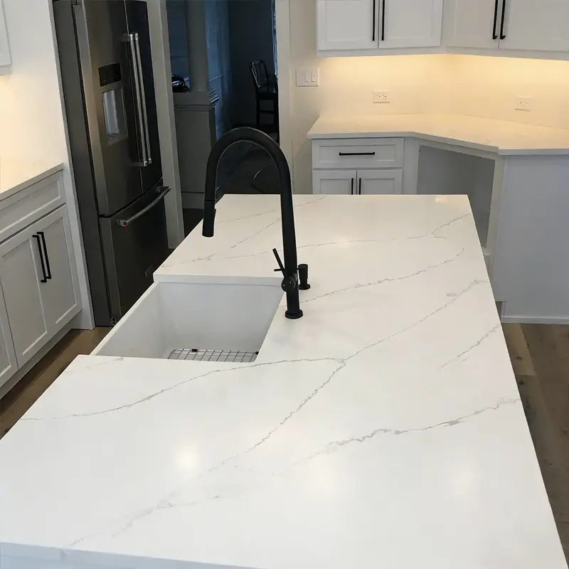 Our advanced manufacturing process ensures that the veining is deep-seated within the stone. While it is not a “random” natural vein, it is designed to be visible through the edge profile, which is essential for creating realistic mitered aprons and under-mount sink cutouts.