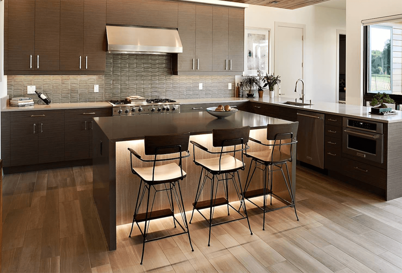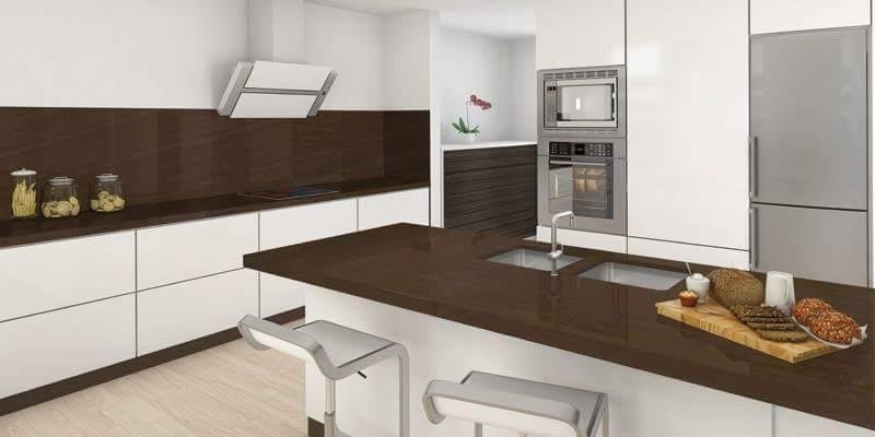 3. Dark Brown quartz stone countertop gives the kitchen top a three-dimensional appearance when viewed from the sides of the counters.