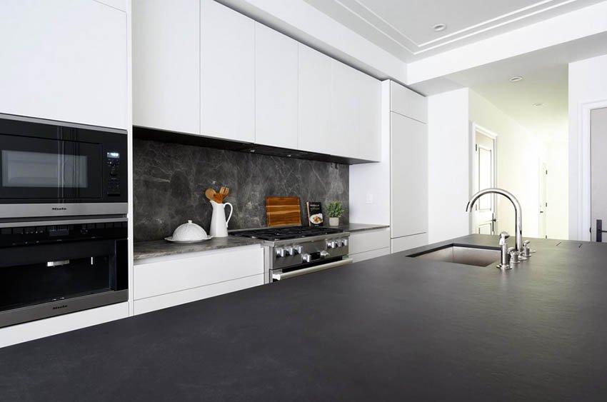 Its solid black backdrop adds much-needed balance and depth, while its white veining prevents your kitchen from being too gloomy.